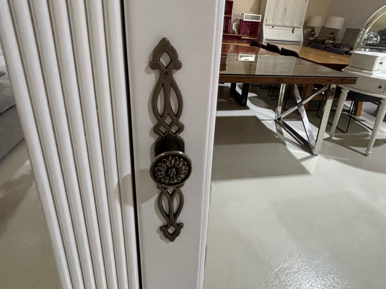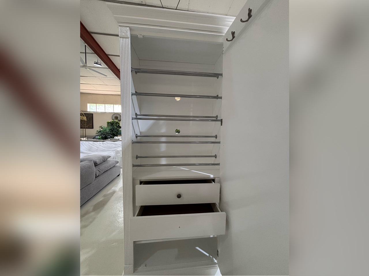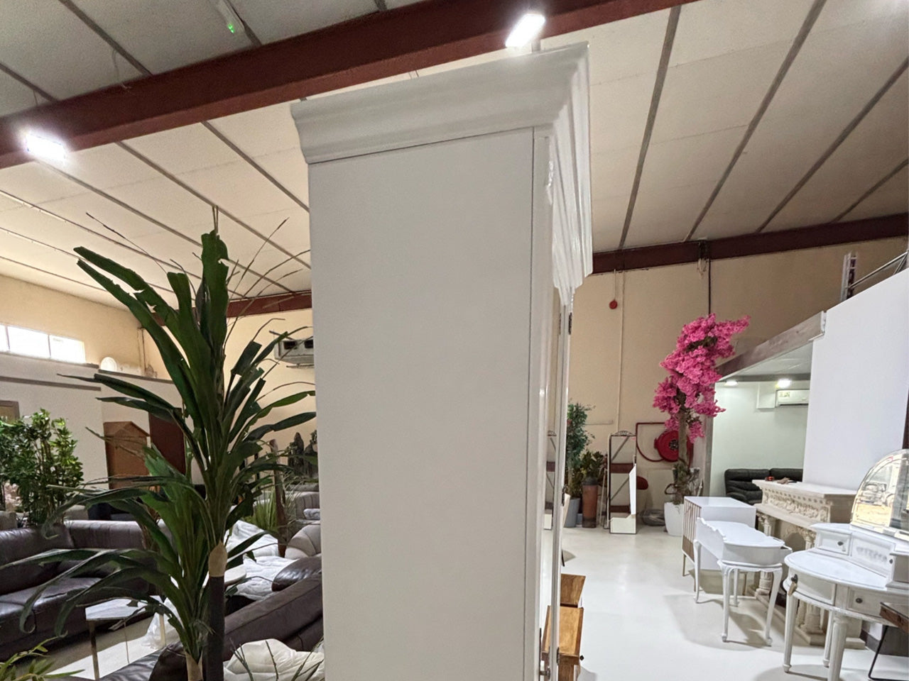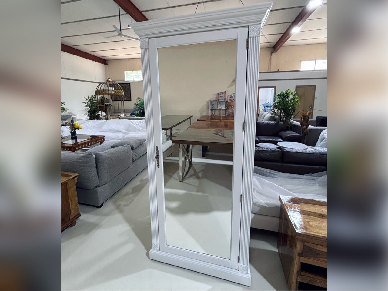 Elegant single-door shoe wardrobe in a timeless white finish, featuring ornate detailing, a full-length mirror, and practical interior with drawer and multiple bars for organized storage. A functional and graceful addition to any bedroom or dressing space.