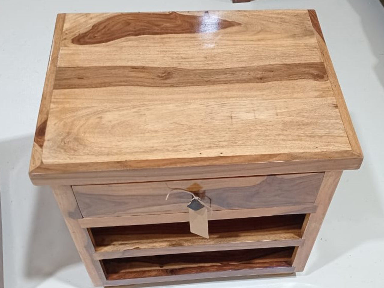 Solid wood nightstands with a drawer and two open shelves, offering clean lines and warm grain for a refined rustic bedroom look.