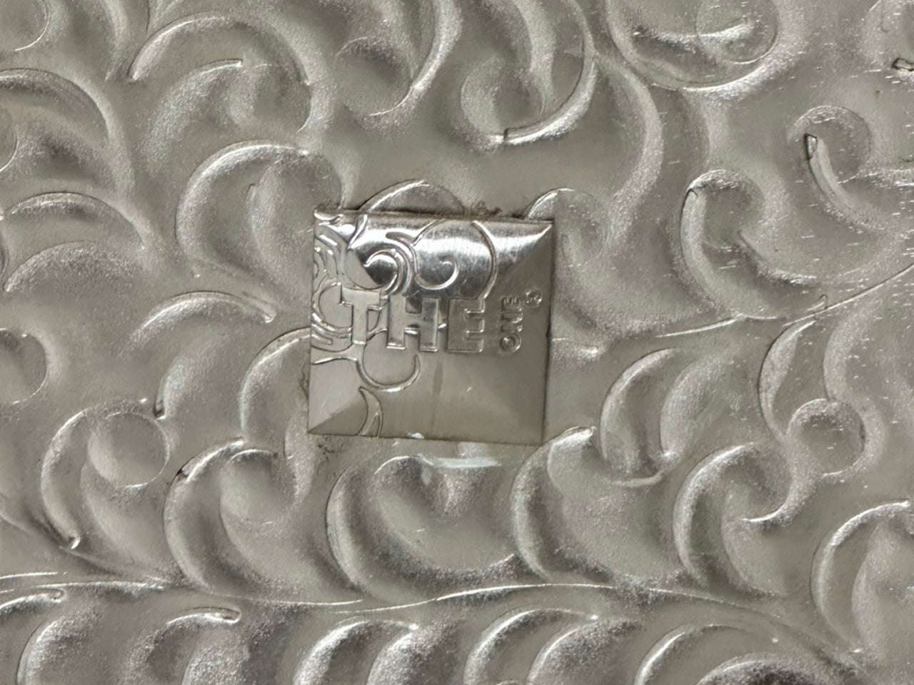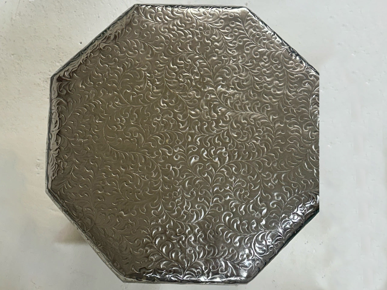 Striking silver side table with a hexagonal sculptural form and embossed hammered finish. Crafted from metal with intricate swirling patterns, it adds an artistic metallic accent to modern, classic, or eclectic interiors.