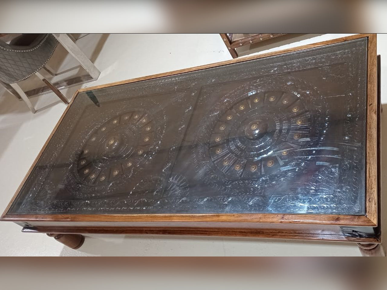 Beautiful solid wood coffee table featuring elegant brass detailing and a glass top with intricate design. A statement piece that blends craftsmanship and luxury, perfect for elevating any modern living space.