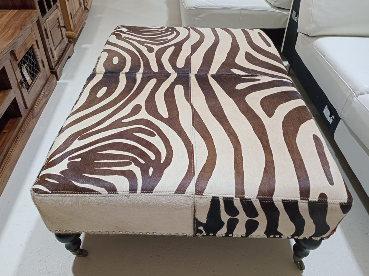Zebra Print Cowhide Ottoman – Wooden Legs